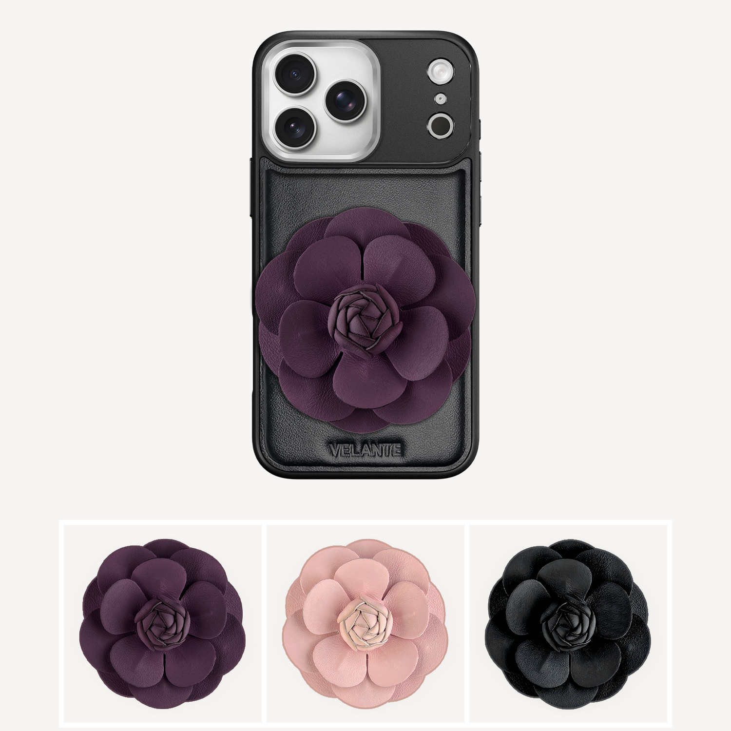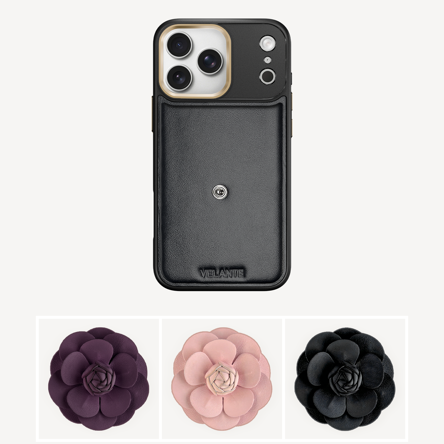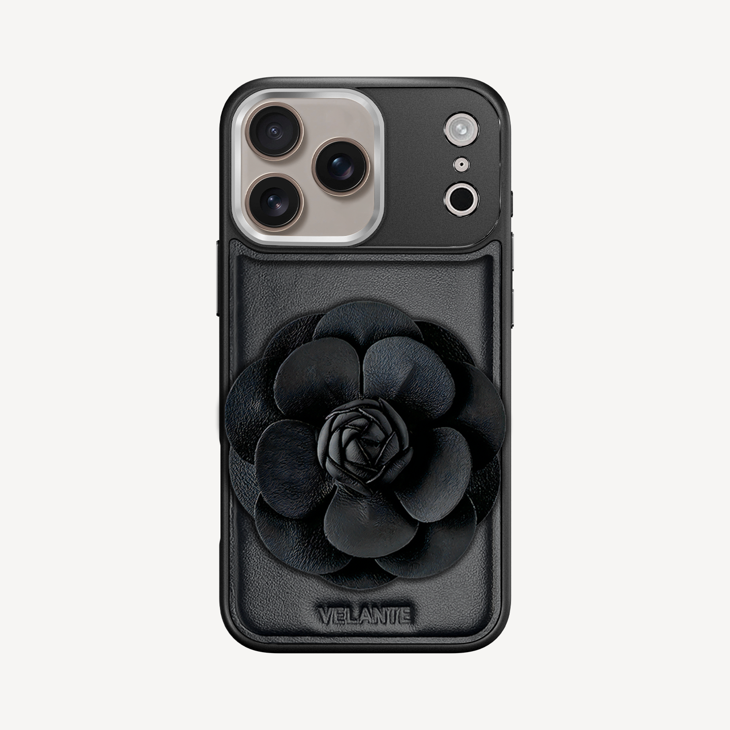 The phone case remains the same: crafted from smooth black leather with subtle VELANTE embossing.