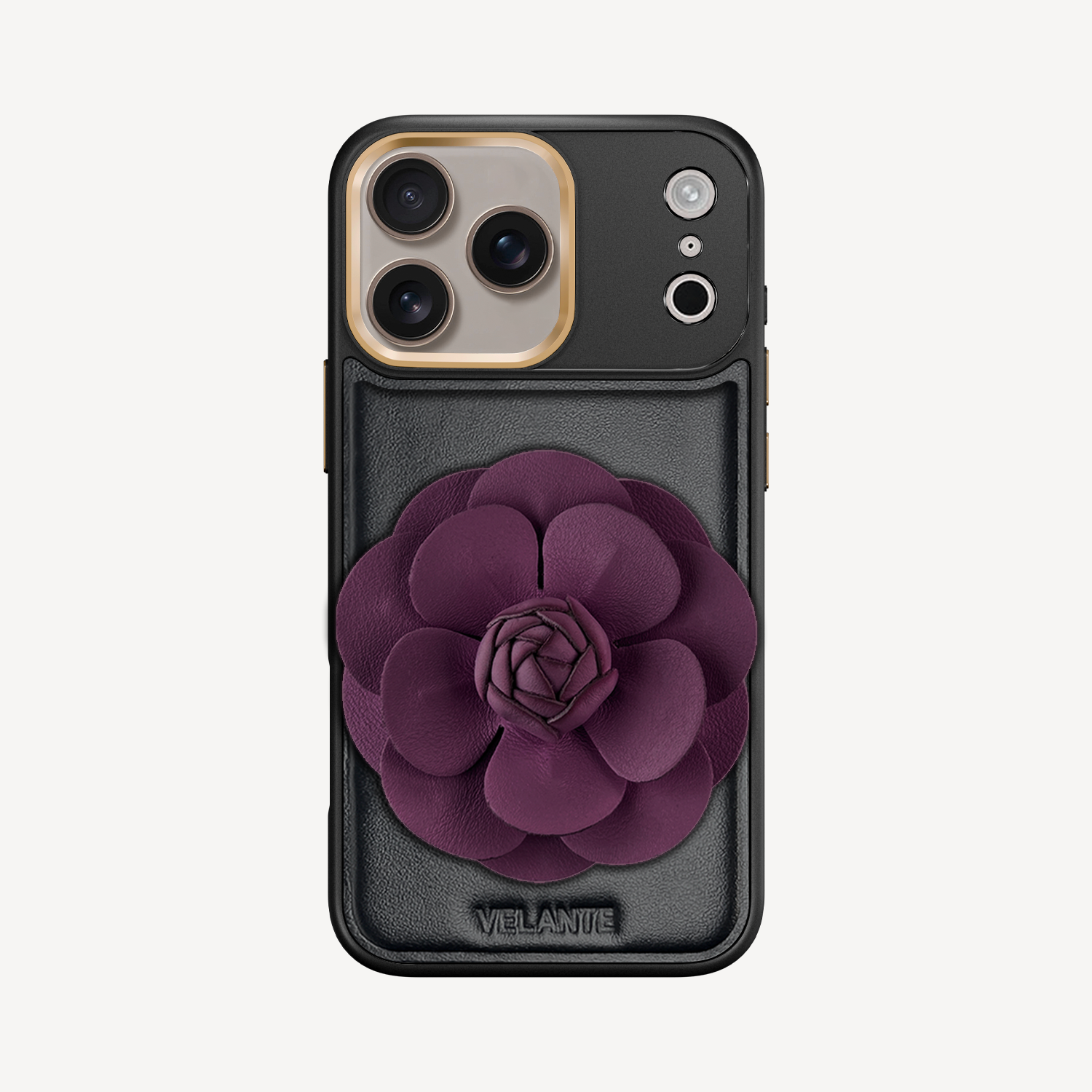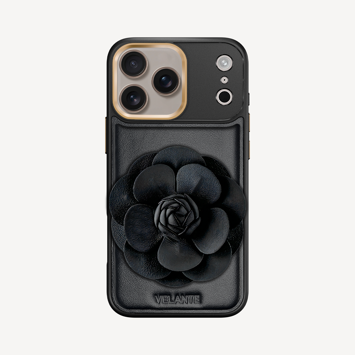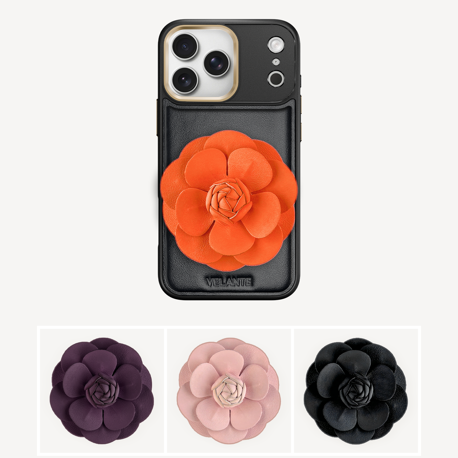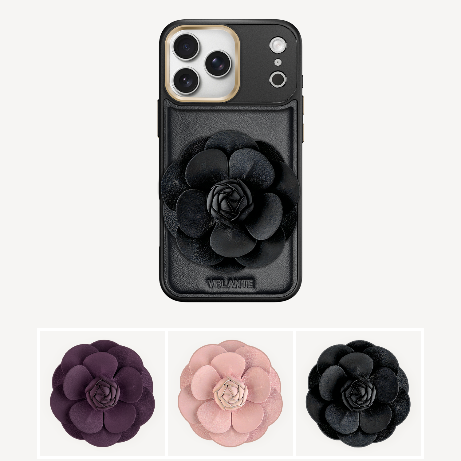 The phone case remains the same: crafted from smooth black leather with subtle VELANTE embossing.