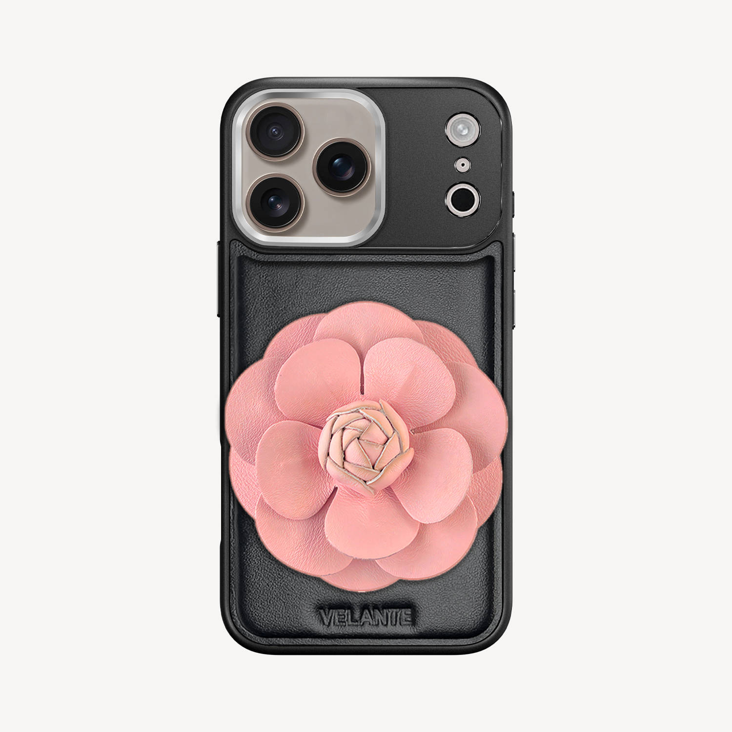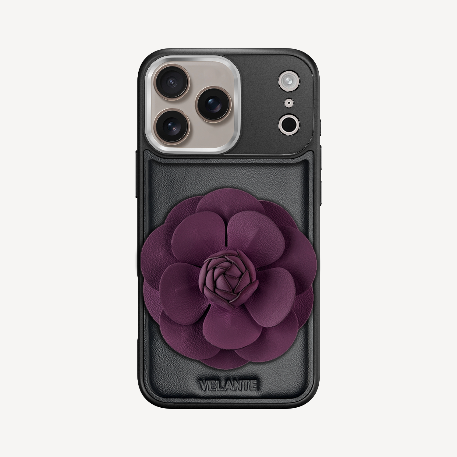 The phone case remains the same: crafted from smooth black leather with subtle VELANTE embossing.