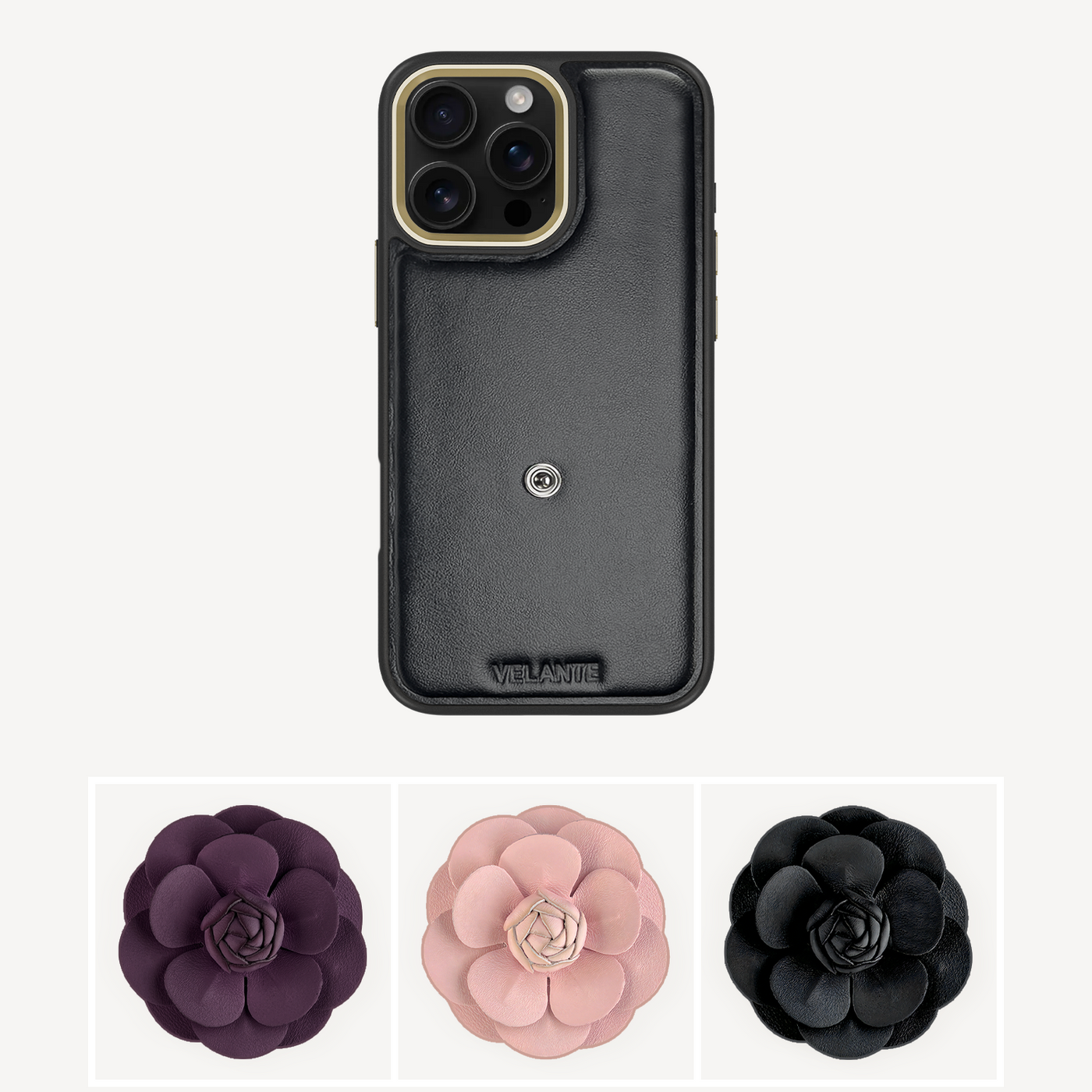 The phone case remains the same: crafted from smooth black leather with subtle VELANTE embossing.