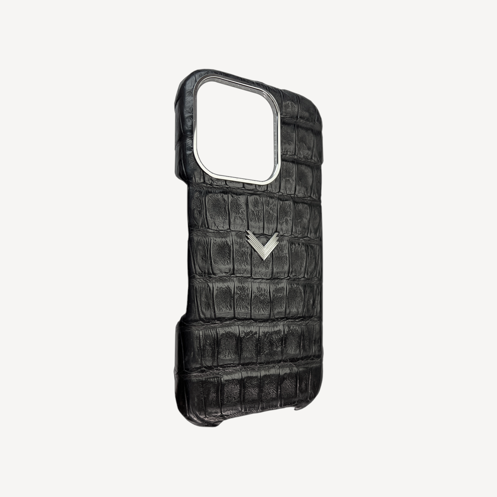 iPhone 16 Pro Phone Case, Crocodile Leather, 14K White Gold VLogo